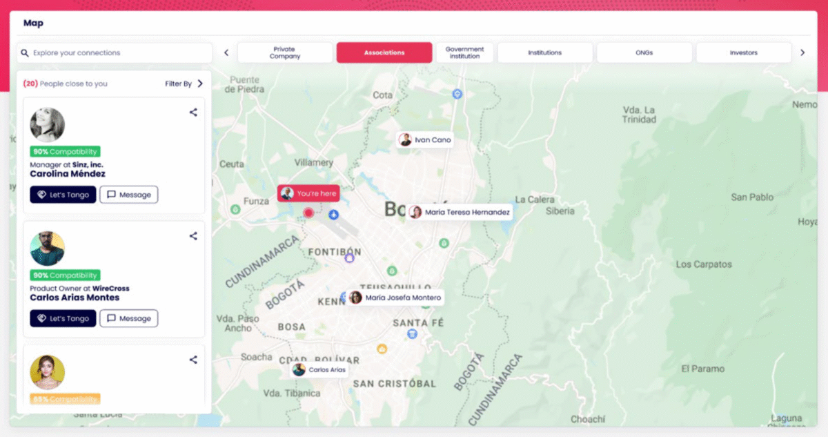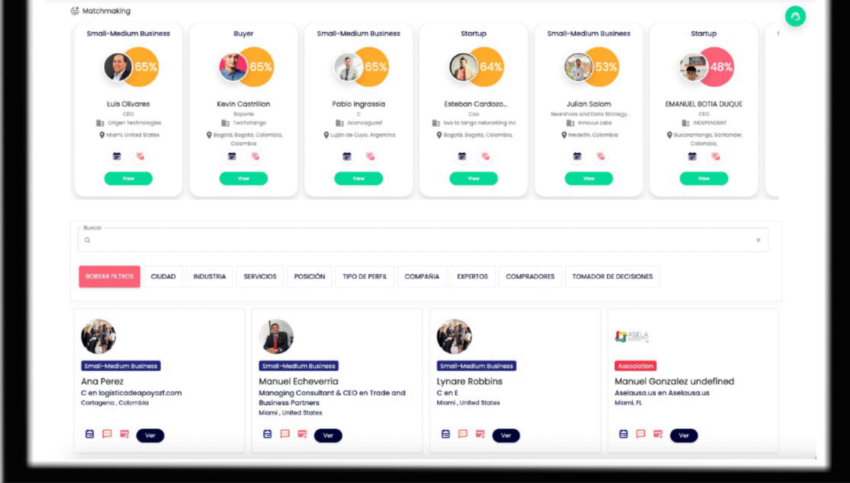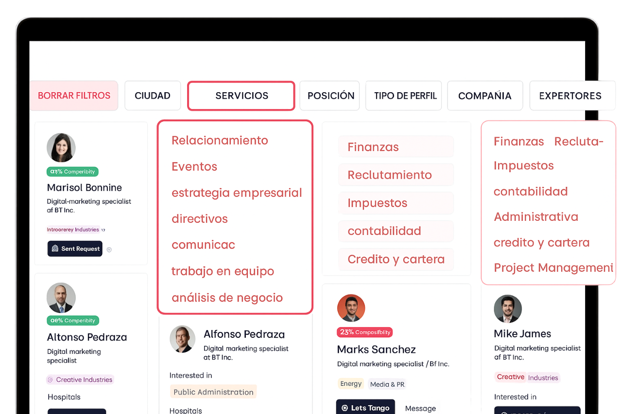 los usuarios pueden buscar conexiones por intereses, experiencia, industria y mucho más.