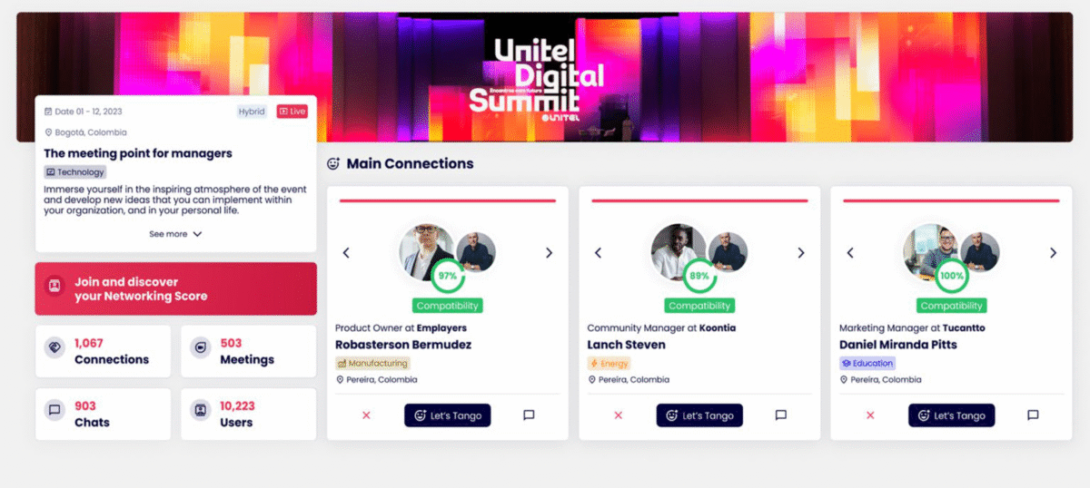 La plataforma utiliza inteligencia artificial para sugerir conexiones potenciales basándose en los perfiles profesionales y los intereses compartidos lo que permite a los usuarios encontrar fácilmente personas con las que puedan entablar conversaciones significativas y ampliar su red de contactos.